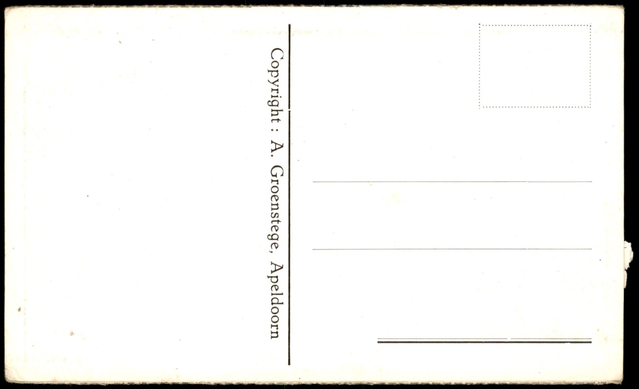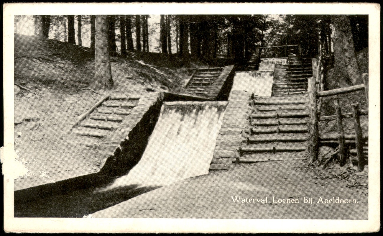 - Schwarz-Weiß-Fotografie des künstlich angelegten Wasserfalls in Loenen bei Apeldoorn (Vrijenbergerspreng). Die Ansicht zeigt die stufenförmige Kaskade mit flankierenden Steintreppen inmitten eines Waldstücks. Gedruckt von A. Groenstege, Apeldoorn.