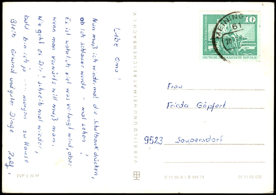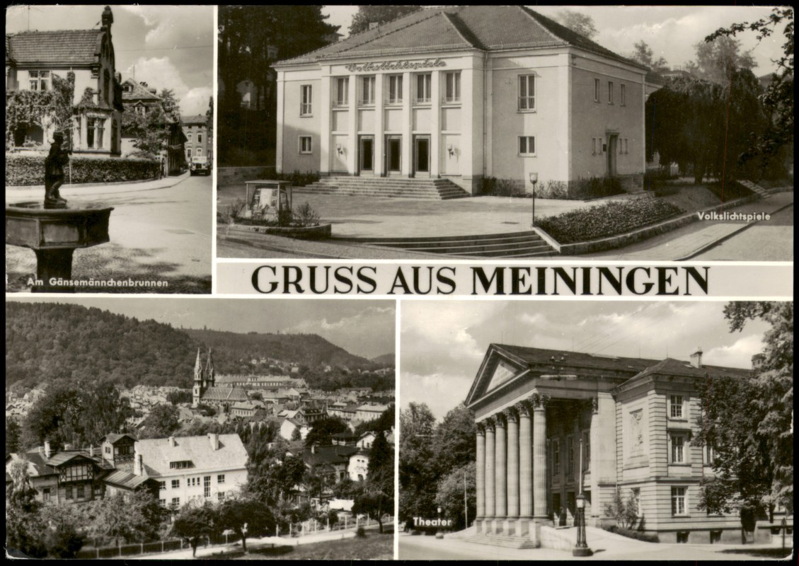 Photo Card: DDR Mehrbild-AK u.a. mit Gänsemännchenbrunnen, Theater - Meiningen
