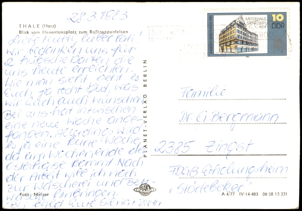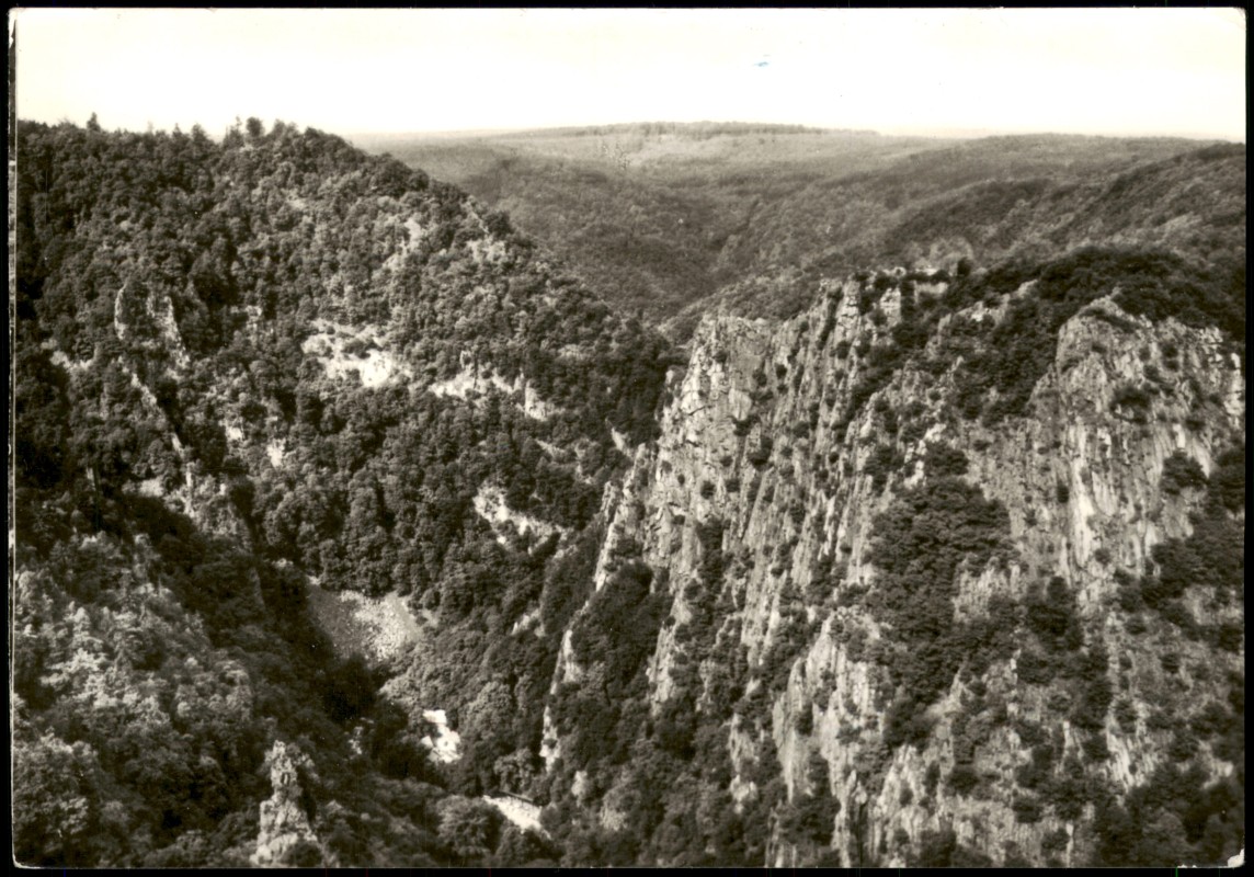 Postcart: Blick vom Hexentanzplatz zum Roßtrappenfelsen - Thale (Harz)
