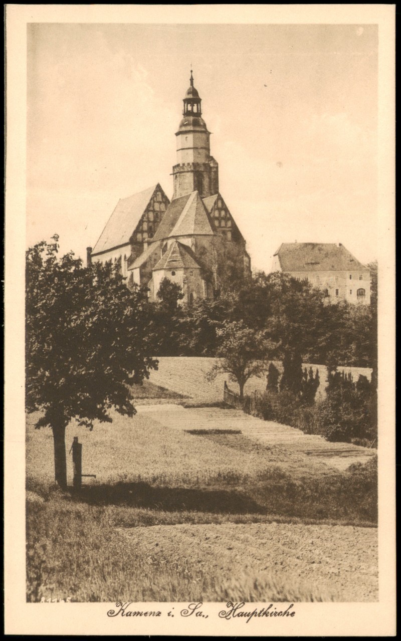 Postcart: Blick von der Wiese auf Hauptkirche Marienkirche - Kamenz