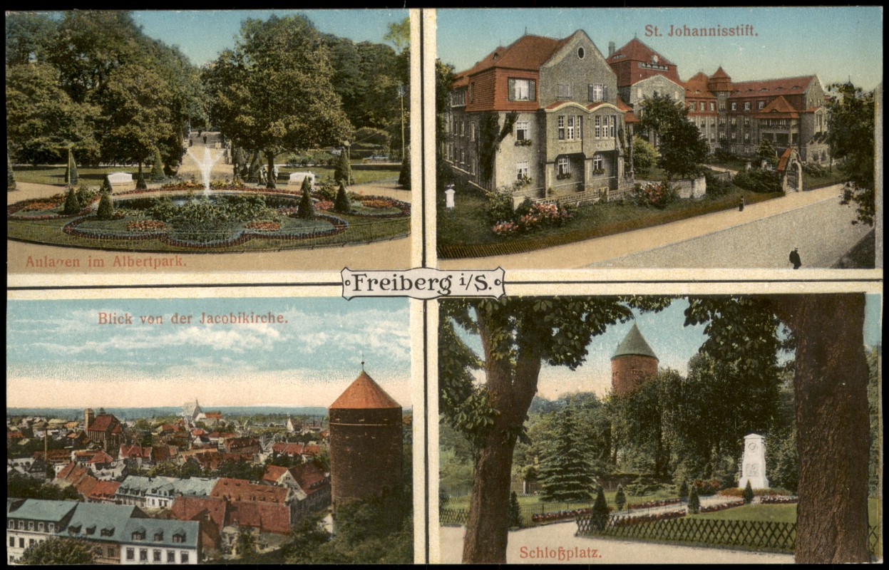 Postcart: Anlagen im Albertpark. Schloßplatz. 4 Bild - Freiberg (Sachsen)