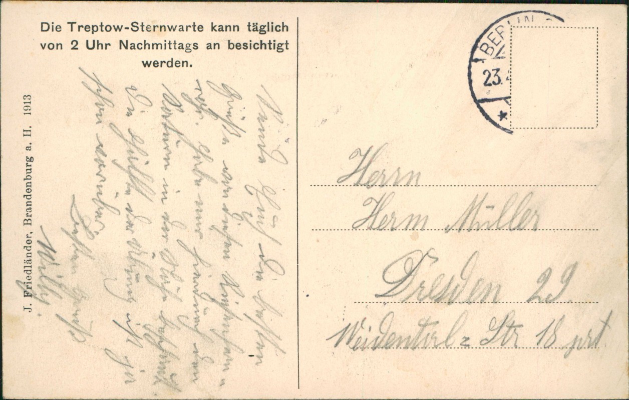 vintage Postcard from 1913: Treptow-Sternwarte - Das große Fernrohr:: Alt-Treptow-Berlin Address side