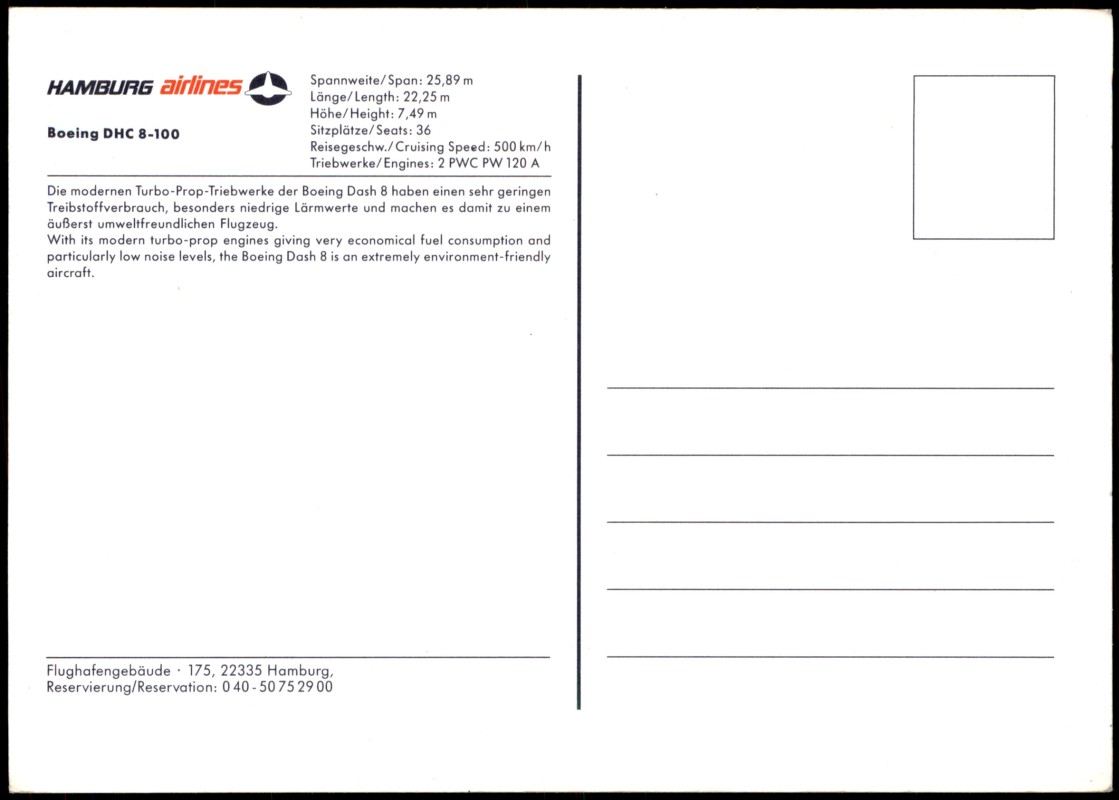 Photo Card: Flugzeug Airplane Boeing DHC 8-100 HAMBURG Airlines