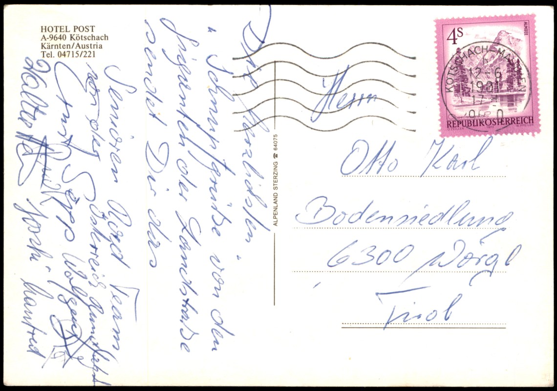 - Die Ansichtskarte zeigt die Außenansicht des Hotel Post in Kötschach, Kärnten. Das mehrstöckige Gebäude präsentiert sich mit einem markanten Schriftzug am Dach, einem Balkon mit Blumenkästen und einem Restaurantbereich im Erdgeschoss. Vor dem Hotel ist ein Gastgarten erkennbar. Im Vordergrund stehen zwei Frauen in traditioneller Kärntner Tracht. Das Hotel wurde zur Zeit der Aufnahme von der Familie Klauss geführt.