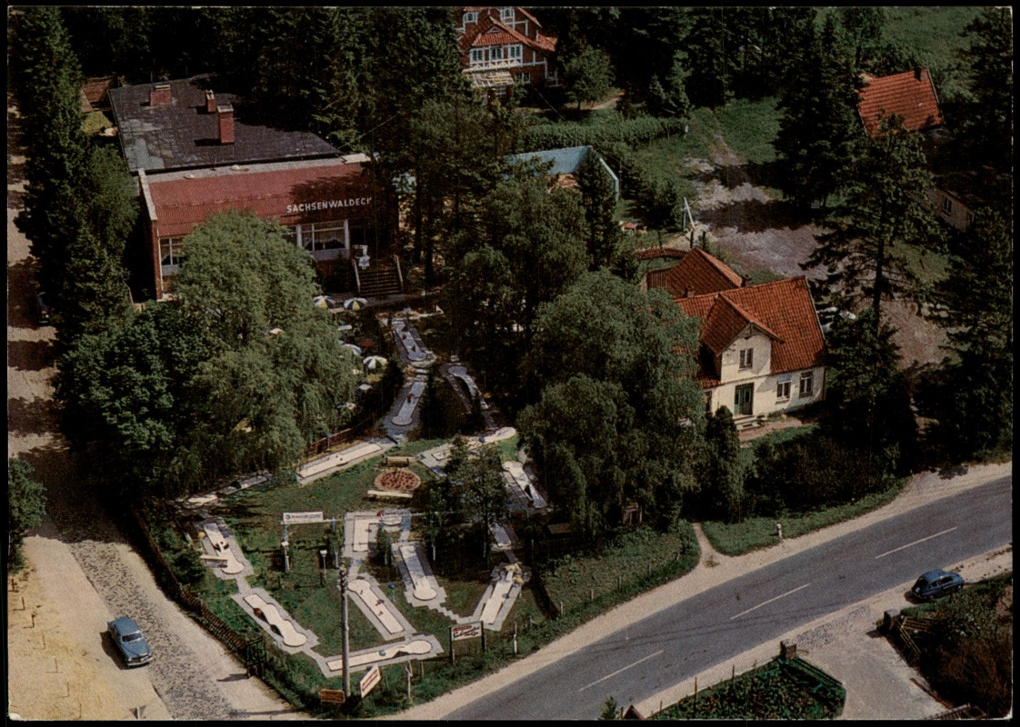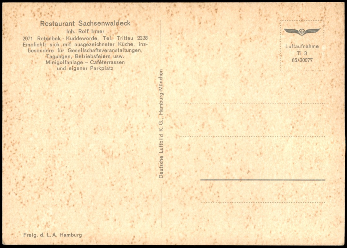- Farbige Luftaufnahme des Restaurants 'Sachsenwaldeck' in Rotenbek-Kuddewörde (Inhaber Rolf Irmer). Die Ansicht zeigt das Restaurantgebäude, die weitläufige Minigolfanlage im Vordergrund, Caféterrassen sowie den Parkplatz. Die Karte wirbt mit ausgezeichneter Küche und Eignung für Gesellschaftsveranstaltungen und Tagungen.