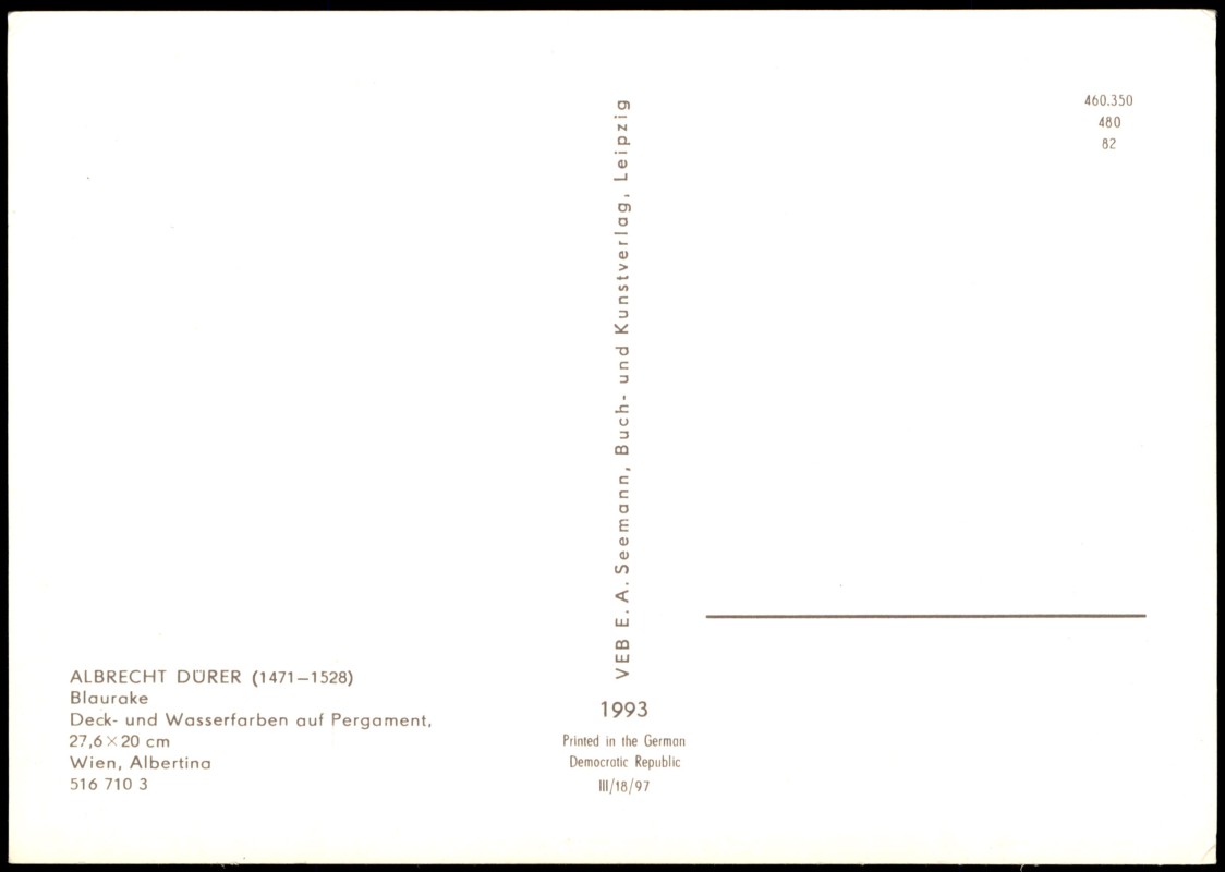 Postcart: Künstlerkarte DDR ALBRECHT DÜRER Vogel Motiv Blaurake