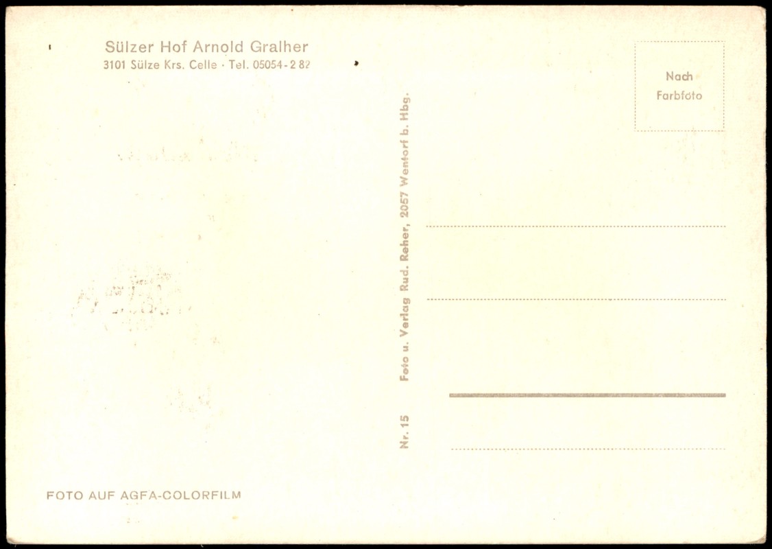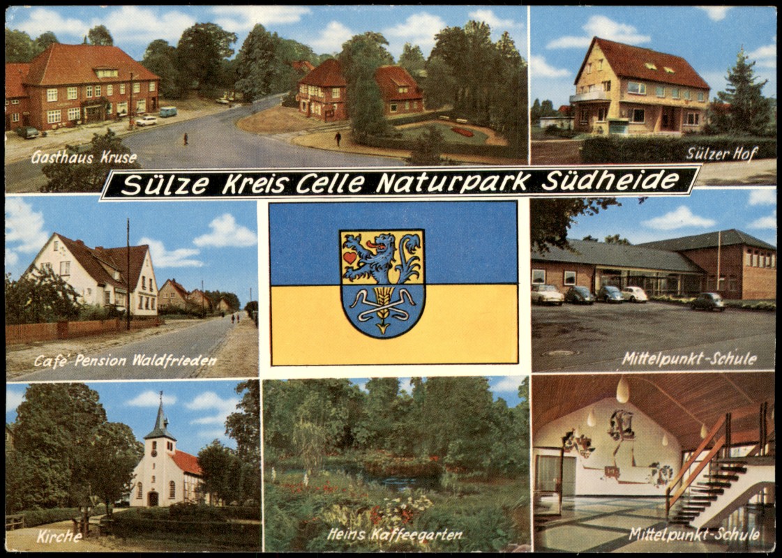 - Farbige Mehrbildkarte aus Sülze im Naturpark Südheide. Die Karte zeigt acht verschiedene Ansichten: Gasthaus Kruse, Sülzer Hof, Café Pension Waldfrieden, die örtliche Kirche, Heins Kaffeegarten sowie zwei Ansichten der Mittelpunkt-Schule (Außenansicht und Innenansicht der Aula). In der Mitte der Karte ist das Wappen von Sülze abgebildet. Auf der Rückseite ist Arnold Gralher als Inhaber des Sülzer Hofs vermerkt.