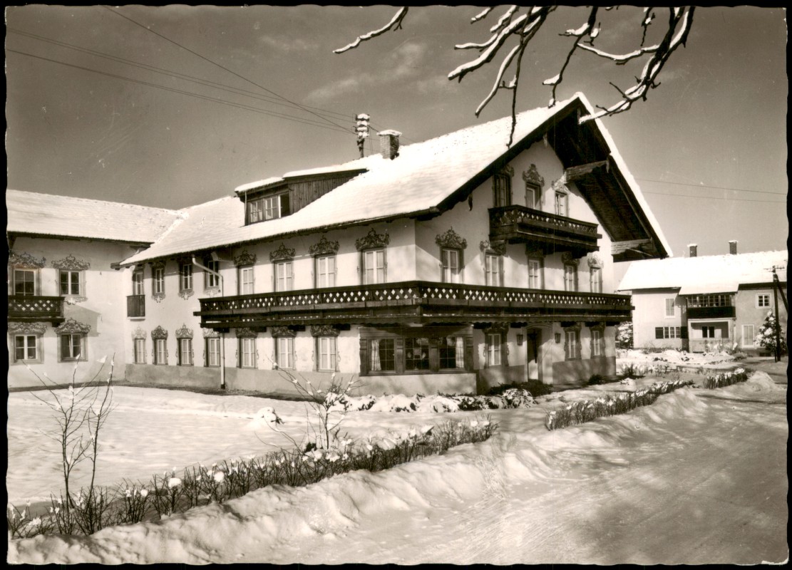 - Echt-Foto-Postkarte des Landhauses der Kuranstalt Harthausen in Bad Aibling. Die Schwarz-Weiß-Aufnahme zeigt das Gebäude in einer verschneiten Winterlandschaft. Die Architektur ist im alpenländischen Stil mit weit ausladenden Holzbalkonen und verzierten Fensterläden gehalten.