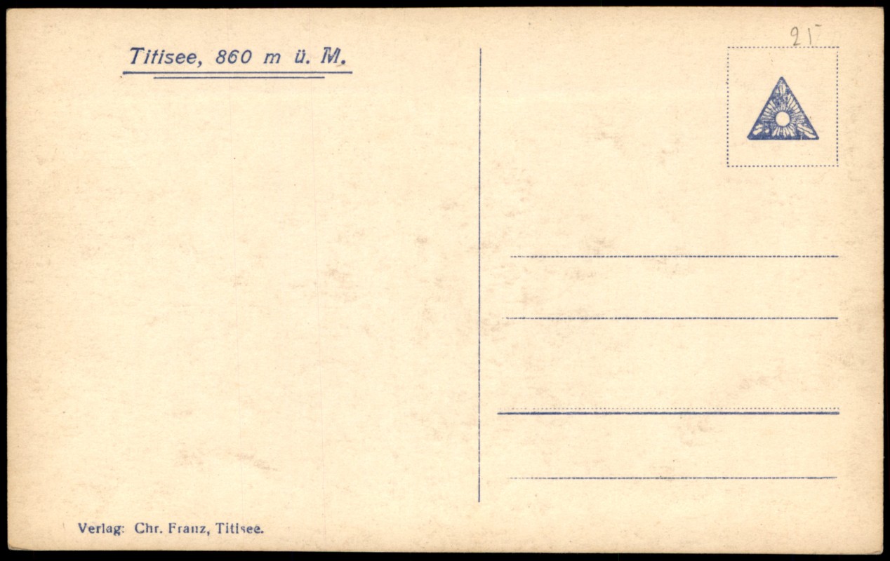 - Echtfoto-Postkarte mit einer Panorama-Aufnahme des Titisees im Schwarzwald aus erhöhter Perspektive. Im Vordergrund sind Wiesen und verschiedene Gebäude am Seeufer zu sehen, im Hintergrund die bewaldeten Berge des Schwarzwaldes. Die Karte enthält die gedruckte Höhenangabe '860 m ü. M.' sowohl auf der Vorder- als auch auf der Rückseite.