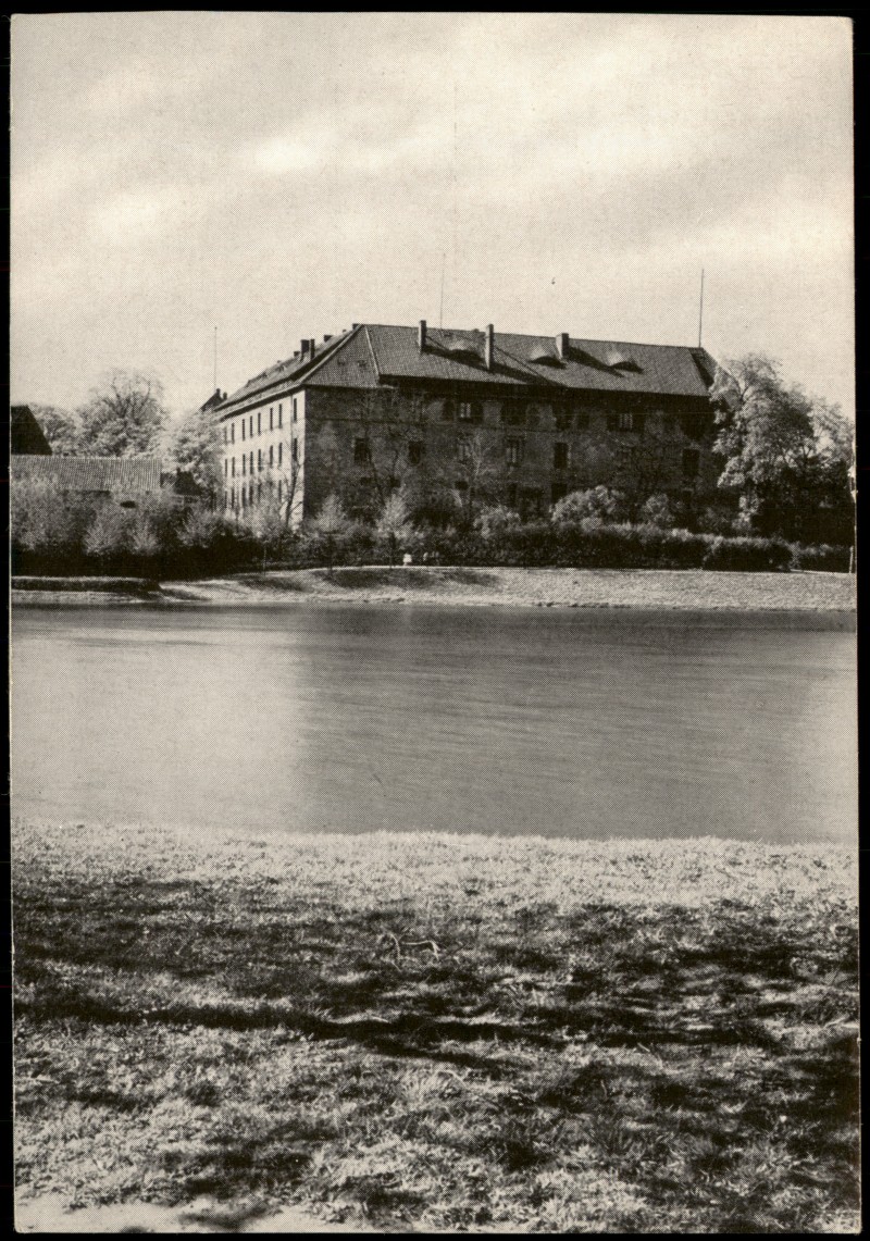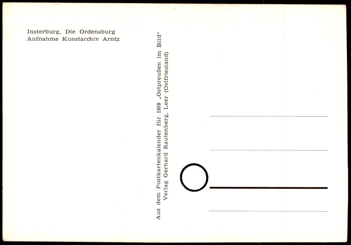 - Schwarz-Weiß-Fotografie der Ordensburg in Insterburg (Ostpreußen), aufgenommen über eine Wasserfläche, vermutlich den Schloßteich. Die Aufnahme stammt aus dem Kunstarchiv Arntz, Insterburg. Die Karte ist ein Blatt aus dem Postkartenkalender 'Ostpreußen im Bild' für das Jahr 1959.