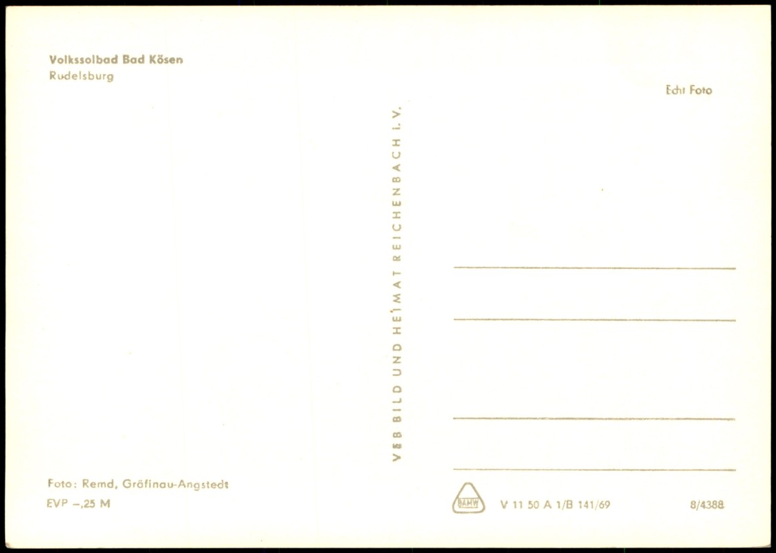 - Echt-Foto-Postkarte aus dem Verlag Bild und Heimat. Die Aufnahme zeigt die historische Rudelsburg auf den Felsen über dem Saaletal bei Bad Kösen. Im Vordergrund ist ein Reisezug mit einer Elektrolokomotive der Deutschen Reichsbahn auf einer steinernen Bogenbrücke (Viadukt) zu sehen. Das Foto stammt von Remd aus Gräfinau-Angstedt. Die Karte wurde in der DDR produziert (EVP 0,25 M).