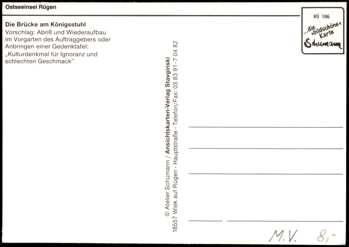 - Satirische Ansichtskarte mit einer kritischen Darstellung der Brückenkonstruktion am Königsstuhl auf der Ostseeinsel Rügen. Die Vorderseite zeigt die hölzerne Brücke mit der Aufschrift 'Das MONSTRUM vom Königsstuhl'. Die Rückseite enthält einen polemischen Text, der den Abriss und Wiederaufbau im Vorgarten des Auftraggebers oder eine Gedenktafel für 'Ignoranz und schlechten Geschmack' vorschlägt. Herausgegeben vom Atelier Schumann / Ansichtskarten-Verlag Stavginski aus Wiek auf Rügen.
