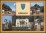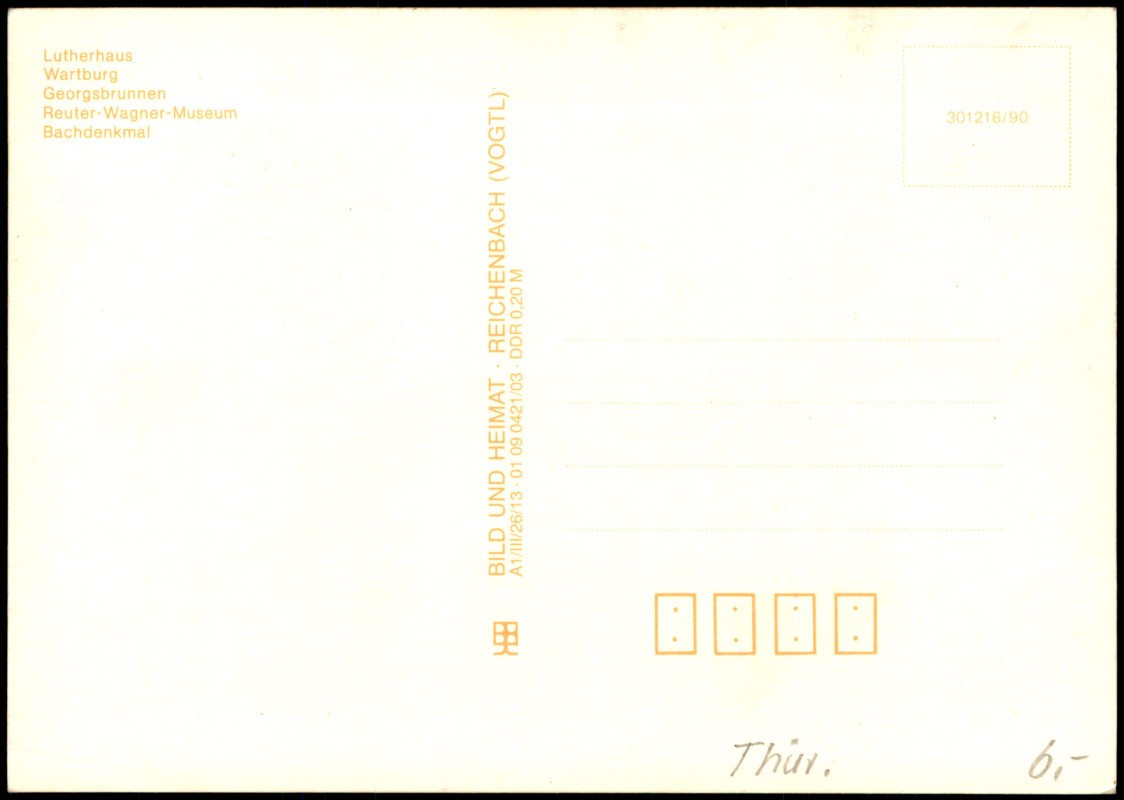 - Farbige Mehrbildkarte (DDR-Produktion) mit fünf Motiven aus Eisenach: Oben links das Lutherhaus (Fachwerkbau), oben rechts die Wartburg, unten links der Georgsbrunnen (Marktbrunnen), unten mittig das Reuter-Wagner-Museum (Fritz-Reuter-Villa) und unten rechts das Bachdenkmal. In der oberen Mitte ist das Stadtwappen von Eisenach mit dem Heiligen Georg abgebildet.