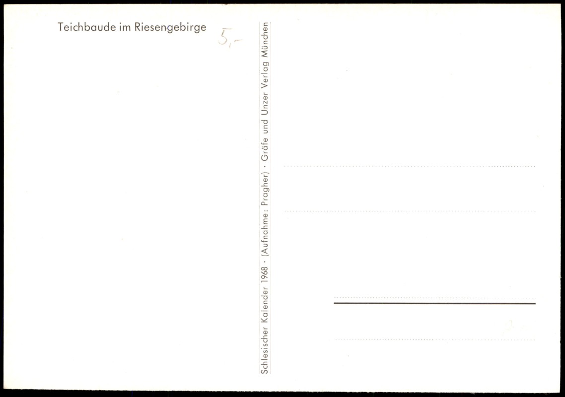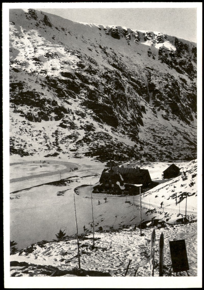 - Winterliche Schwarz-Weiß-Fotografie der Kleinen Teichbaude (heute Schronisko Samotnia) am Kleinen Teich im Riesengebirge. Die Aufnahme stammt von Pragher und wurde für den Schlesischen Kalender 1968 im Gräfe und Unzer Verlag, München, veröffentlicht. Im Vordergrund sind Skier im Schnee zu sehen.