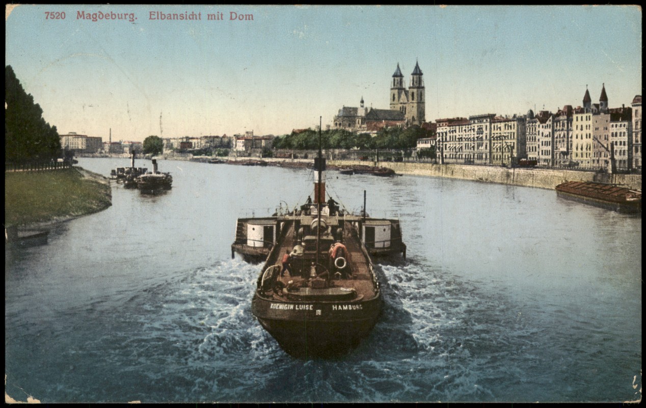 Postcart: Elbpanorama Schiff Koenigin Luise passiert den Dom - Magdeburg