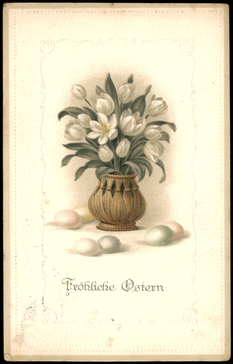 - Ostergrußkarte mit einem Stillleben aus weißen Blüten (vermutlich Tulpen oder Lilien) in einer verzierten Vase, umgeben von mehreren pastellfarbenen Ostereiern. Der gedruckte Gruß 'Fröhliche Ostern' befindet sich unterhalb des Motivs. Die Karte ist von einem dezenten Zierrahmen umgeben. Auf der Rückseite ist das Verlagszeichen 'M.s.i.B.' mit der Seriennummer '935' abgedruckt.