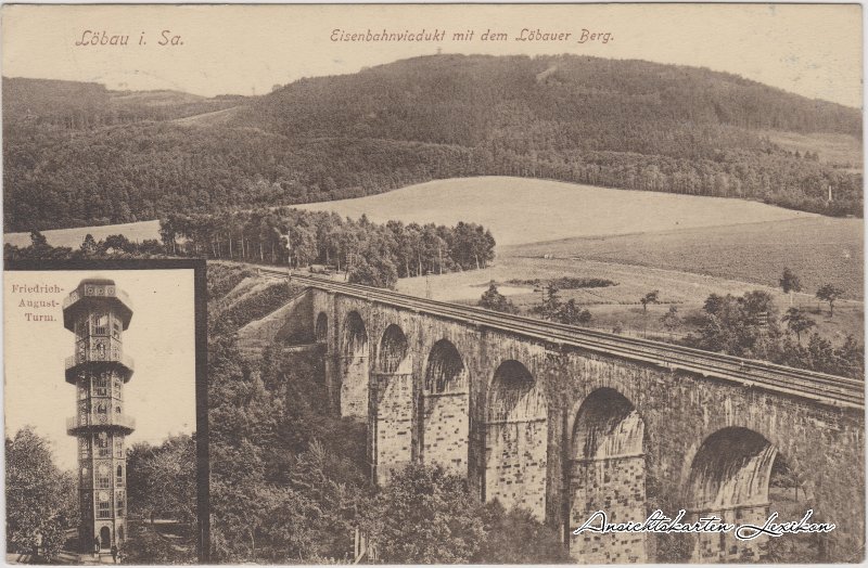 Postcart: Eisenbahnviadukt mit dem Löbauer Berg - Friedrich-August-Turm - Löbau