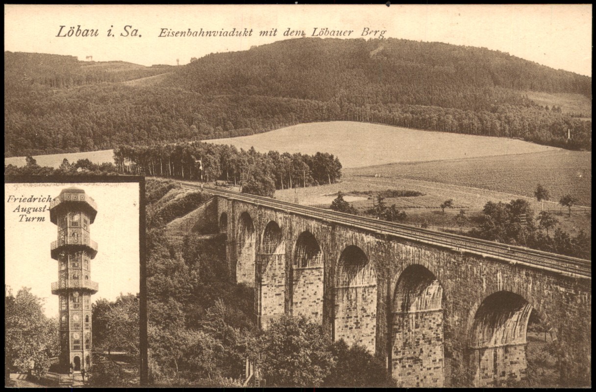- Eisenbahnviadukt mit dem Löbauer Berg - Friedrich-August-Turm