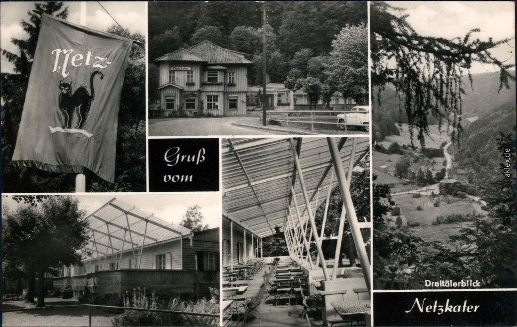 Postcart: Fahne, Ortsmotiv, Gaststätte, Dreitälerblick - Netzkater