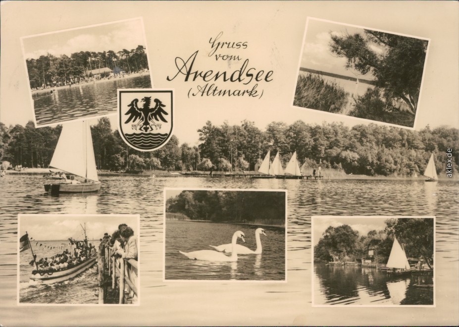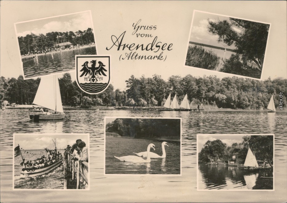 Postcart: Strand, Uferbereich, Segelboote, Kutter, Schwäne - Arendsee (Altmark)