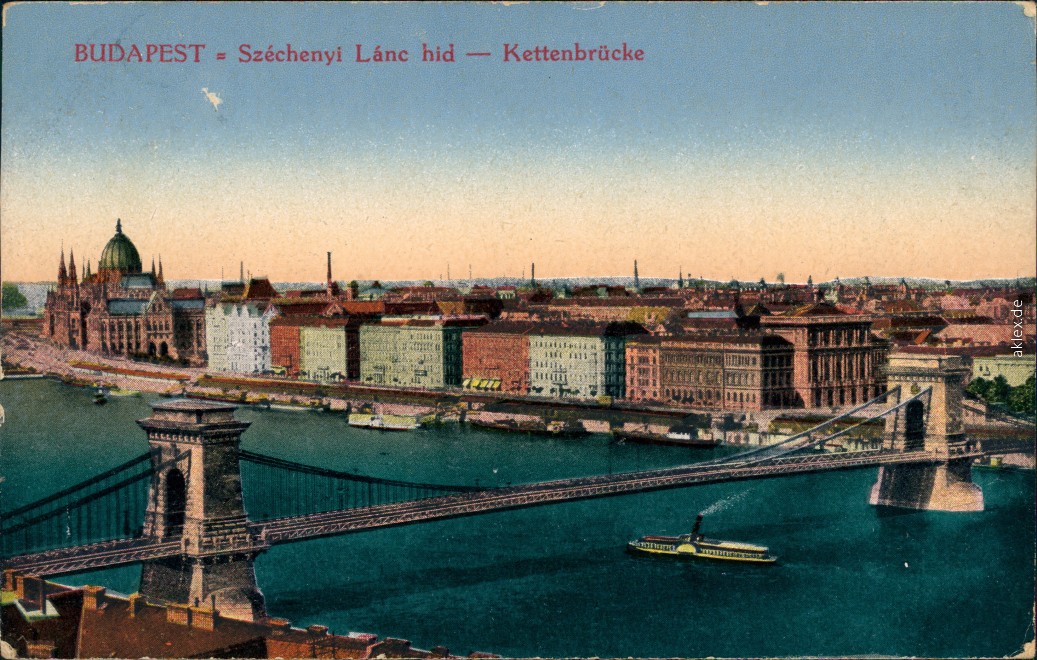 Postcart: Stadt und Kettenbrücke - Dampfer - Budapest