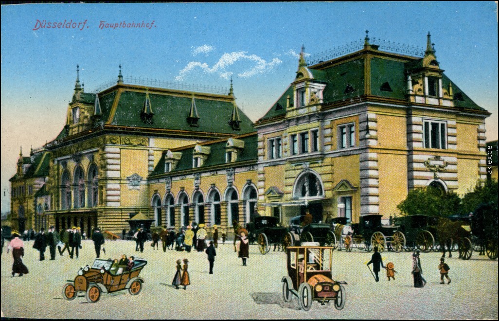 Postcart: Hauptbahnhof, Kutschen, Autos - Düsseldorf