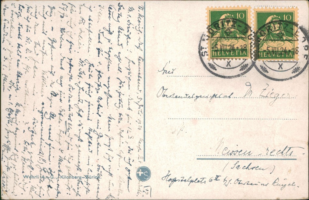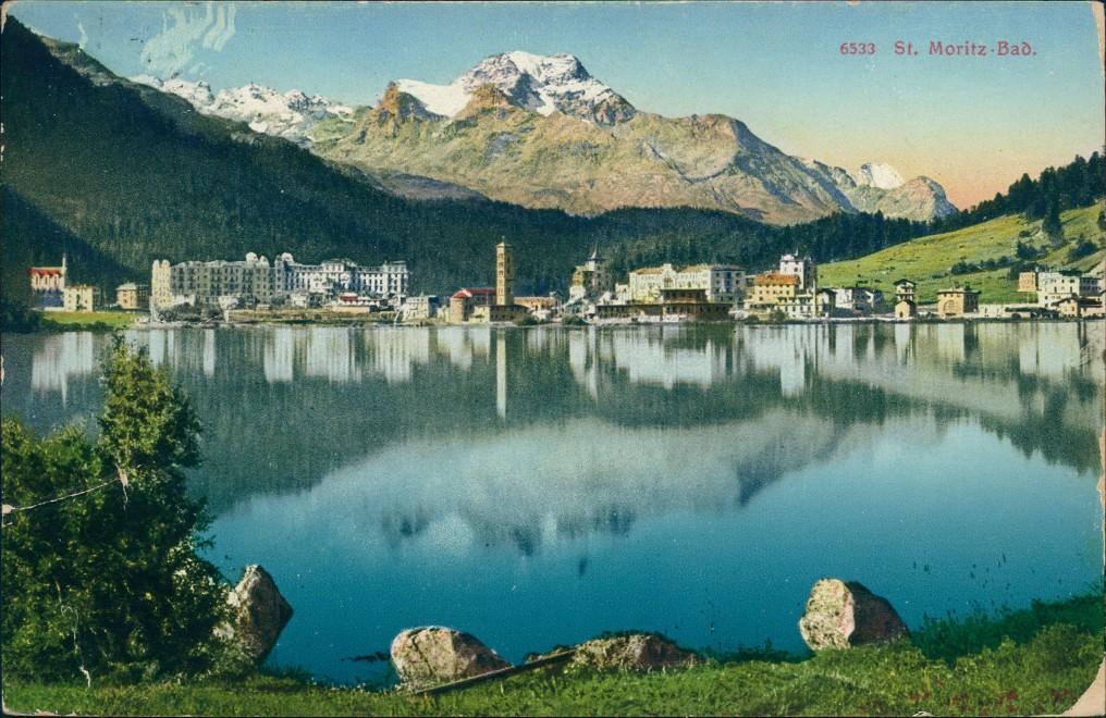 Postcart: Blick auf den Ort mit See und Bergkette - St. Moritz