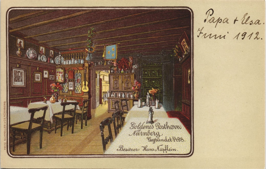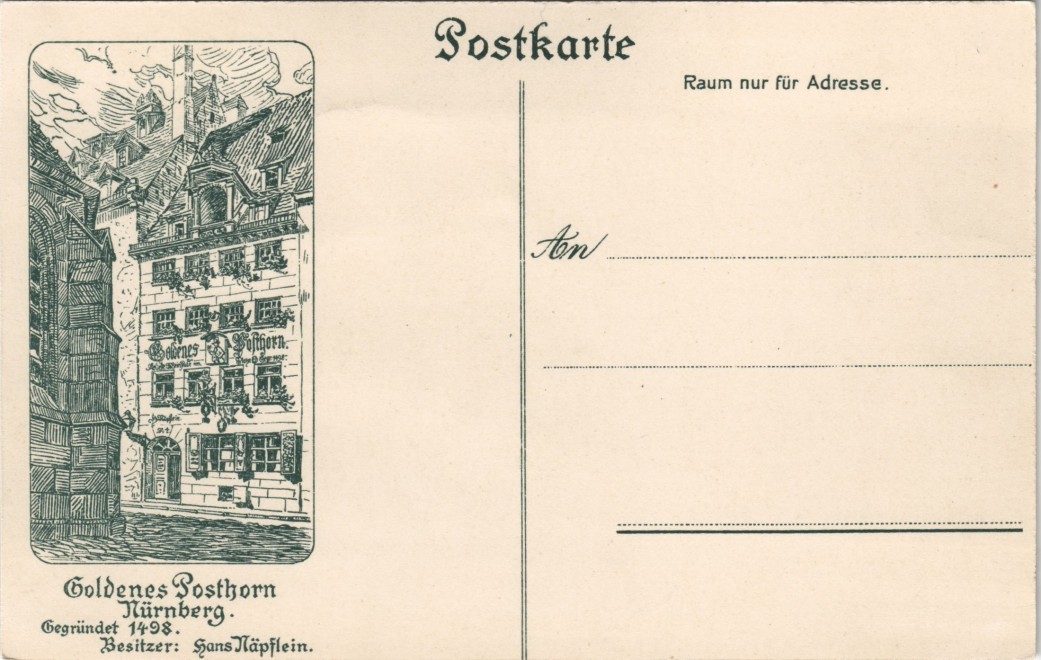 Postcart: Gasthaus Goldenes Posthorn, Bes. Hans Näpflein - Nuremberg