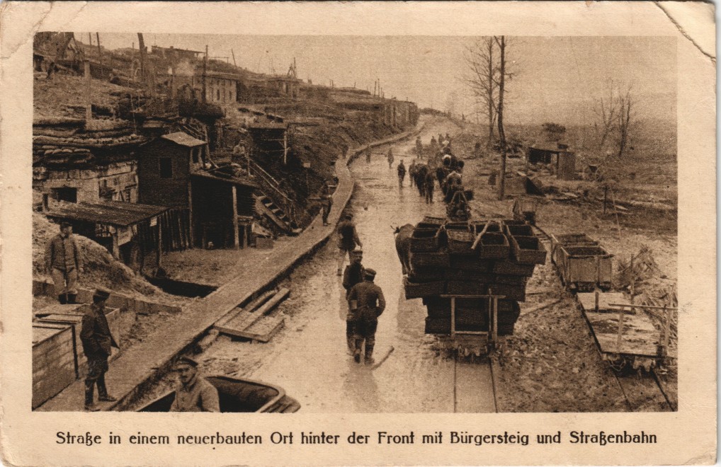 Postcart: Neuerbaute Straße, WK1 gel. Ortskommando-Briefstempel