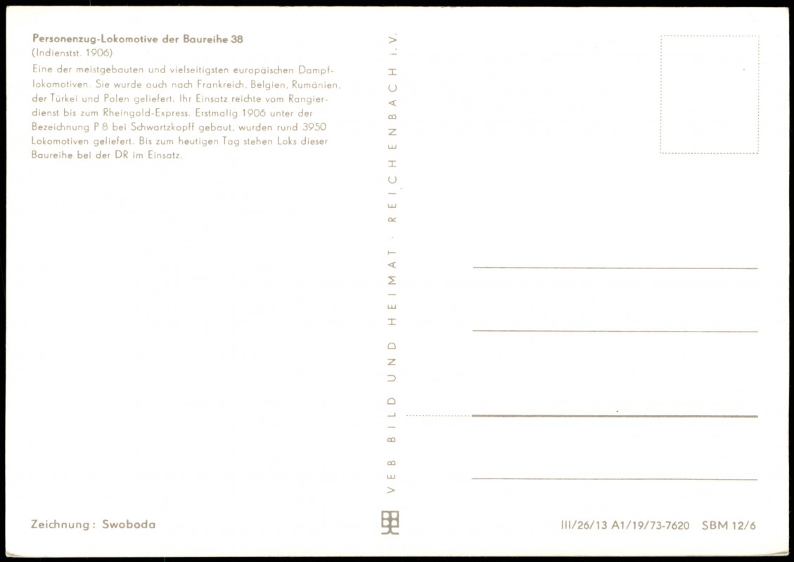 Postcart: Dampflok Motiv-AK Personenzug-Lokomotive der Baureihe 38
