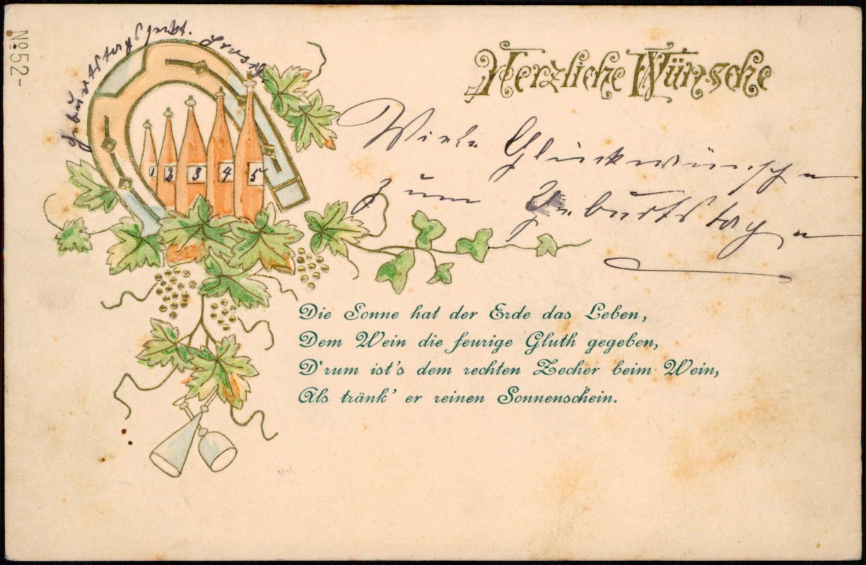 Postcart: Glückwunsch Hufeneisen, Weinflaschen - Spruch