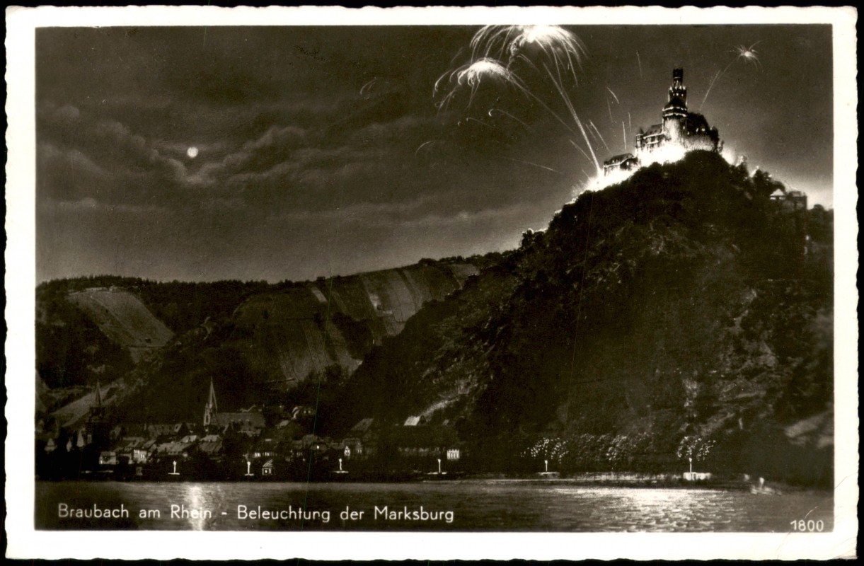 Postcart: Beleuchtung der Marksburg - Feuerwerk - Braubach