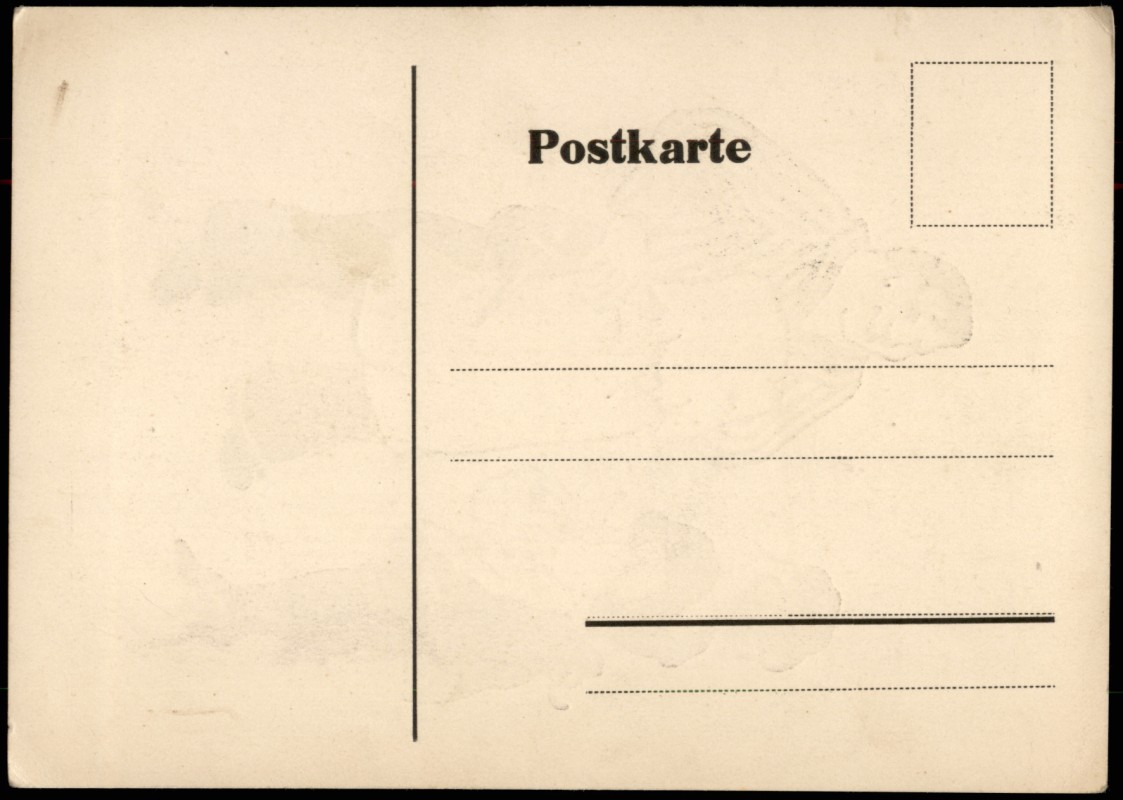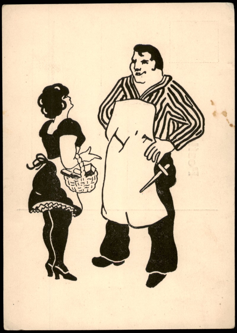 Postcart: Scherenschnitt/Schattenschnitt Frau mit Korb vor Mann