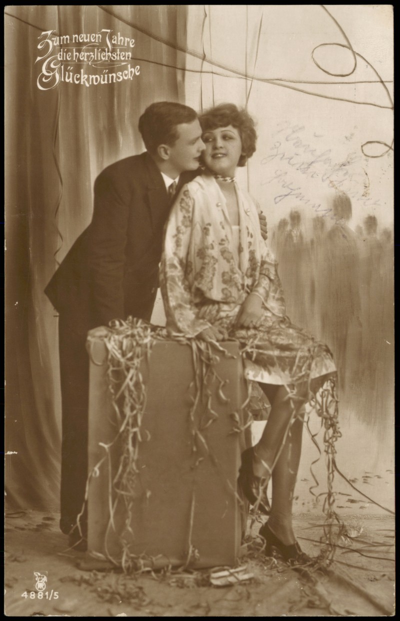 Postcart: Neujahr Sylvester New Year Liebespaar feiert Mode Kleid