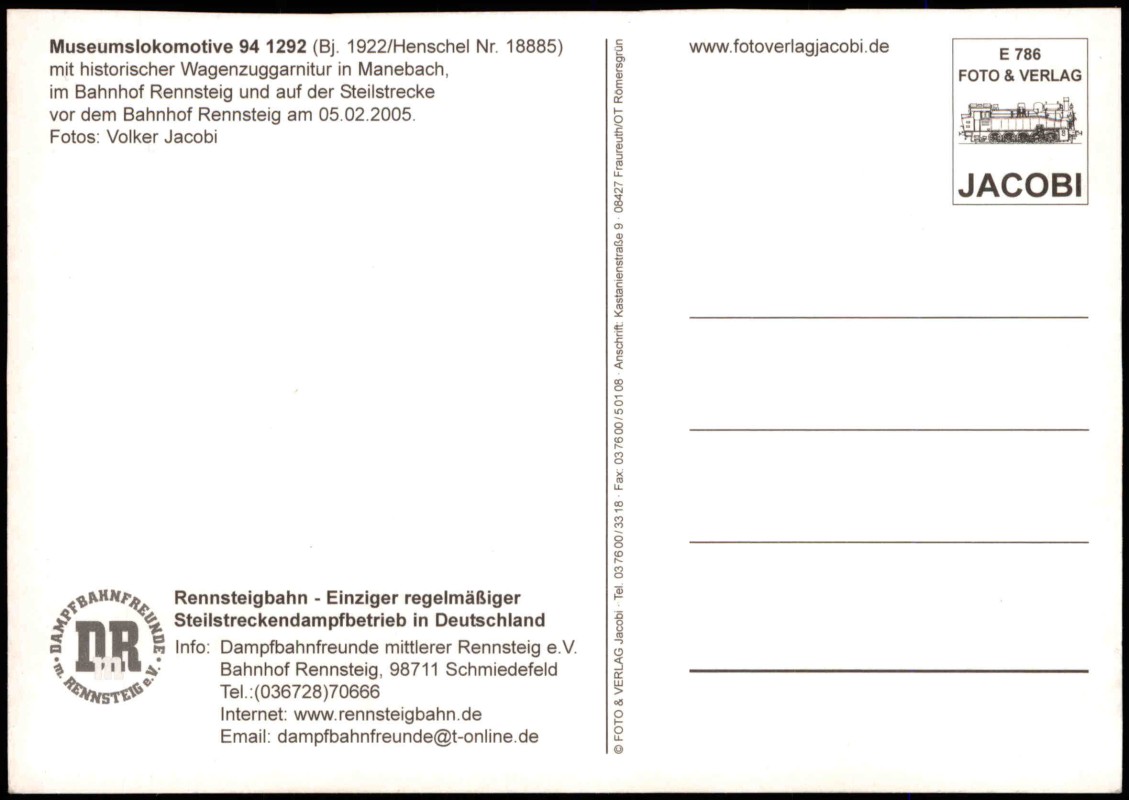 - Museumslokomotive 94 1292 (Bj. 1922/Henschel Nr. 18885) mit historischer Wagenzuggarnitur in Manebach, im Bahnhof Rennsteig und auf der Steilstrecke vor dem Bahnhof Rennsteig am 05.02.2005.