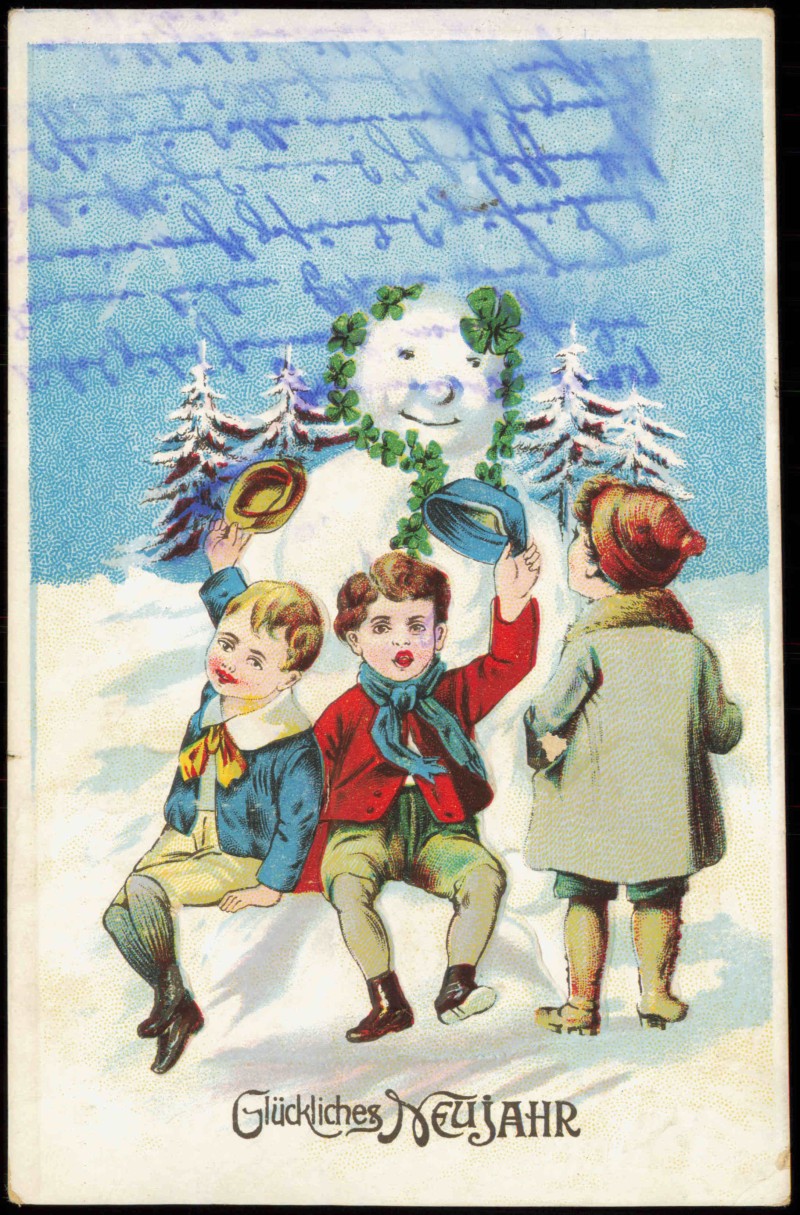 Postcart: Neujahr Sylvester New Year Jungen sitzen auf Schneemann
