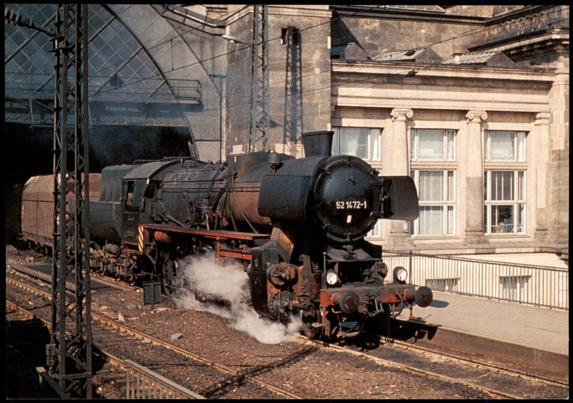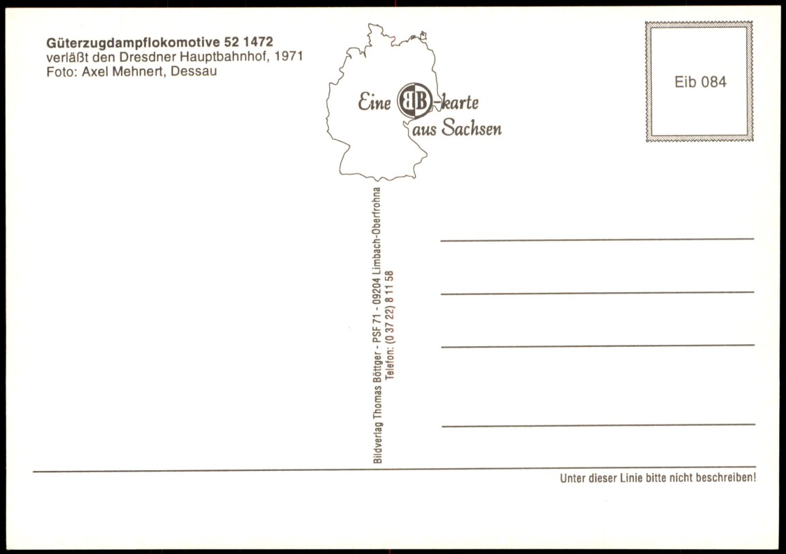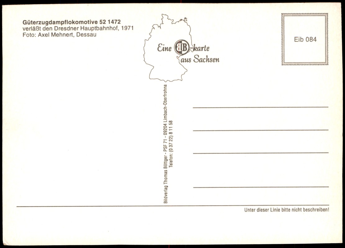 - Eine Güterzugdampflokomotive der Baureihe 52 mit der Betriebsnummer 52 1472 verlässt im Jahr 1971 den Dresdner Hauptbahnhof. Das Foto wurde von Axel Mehnert aus Dessau aufgenommen. Die Postkarte wurde vom Bildverlag Thomas Böttger aus Limbach-Oberfrohna herausgegeben und trägt die Seriennummer Eib 084. Sie wird als 'B-karte aus Sachsen' beworben.