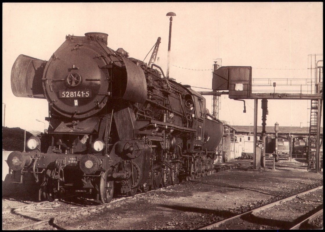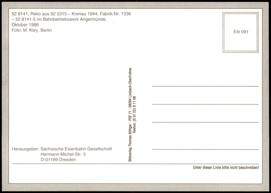 - Ansicht der Rekonstruktionsdampflokomotive 52 8141-5 (Reko aus 52 5315, Krenau 1944, Fabrik-Nr. 1336) im Bahnbetriebswerk Angermünde. Das Foto wurde im Oktober 1986 von M. Kley, Berlin, aufgenommen. Die Postkarte wurde von der Sächsischen Eisenbahn-Gesellschaft herausgegeben und vom Bildverlag Thomas Böttger vertrieben. Die Seriennummer der Karte ist Eib 091.