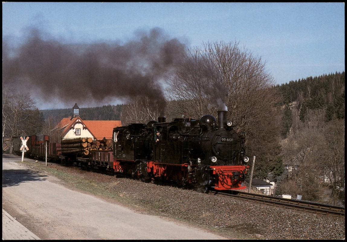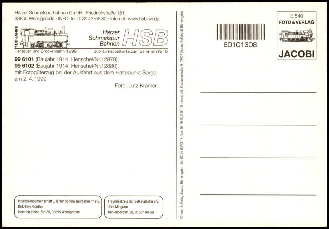 - Jubiläumspostkarte Nr. 6 der Harzer Schmalspurbahnen (HSB) zum 100-jährigen Bestehen im Jahr 1999. Die Karte zeigt die Dampflokomotiven 99 6101 (Baujahr 1914, Henschel/Nr.12879) und 99 6102 (Baujahr 1914, Henschel/Nr.12880) mit einem Fotogüterzug bei der Ausfahrt aus dem Haltepunkt Sorge. Das Foto wurde am 2. April 1999 von Lutz Kramer aufgenommen. Herausgegeben von Foto & Verlag Jacobi, Römersgrün, in Zusammenarbeit mit der Harzer Schmalspurbahnen GmbH und den Vereinen 'Interessengemeinschaft Harzer Schmalspurbahnen' e.V. und 'Freundeskreis der Selketalbahn e.V.'.