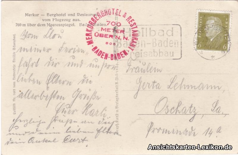 Photo Card: Berghotel und Restaurant - Luftbild - Baden-Baden