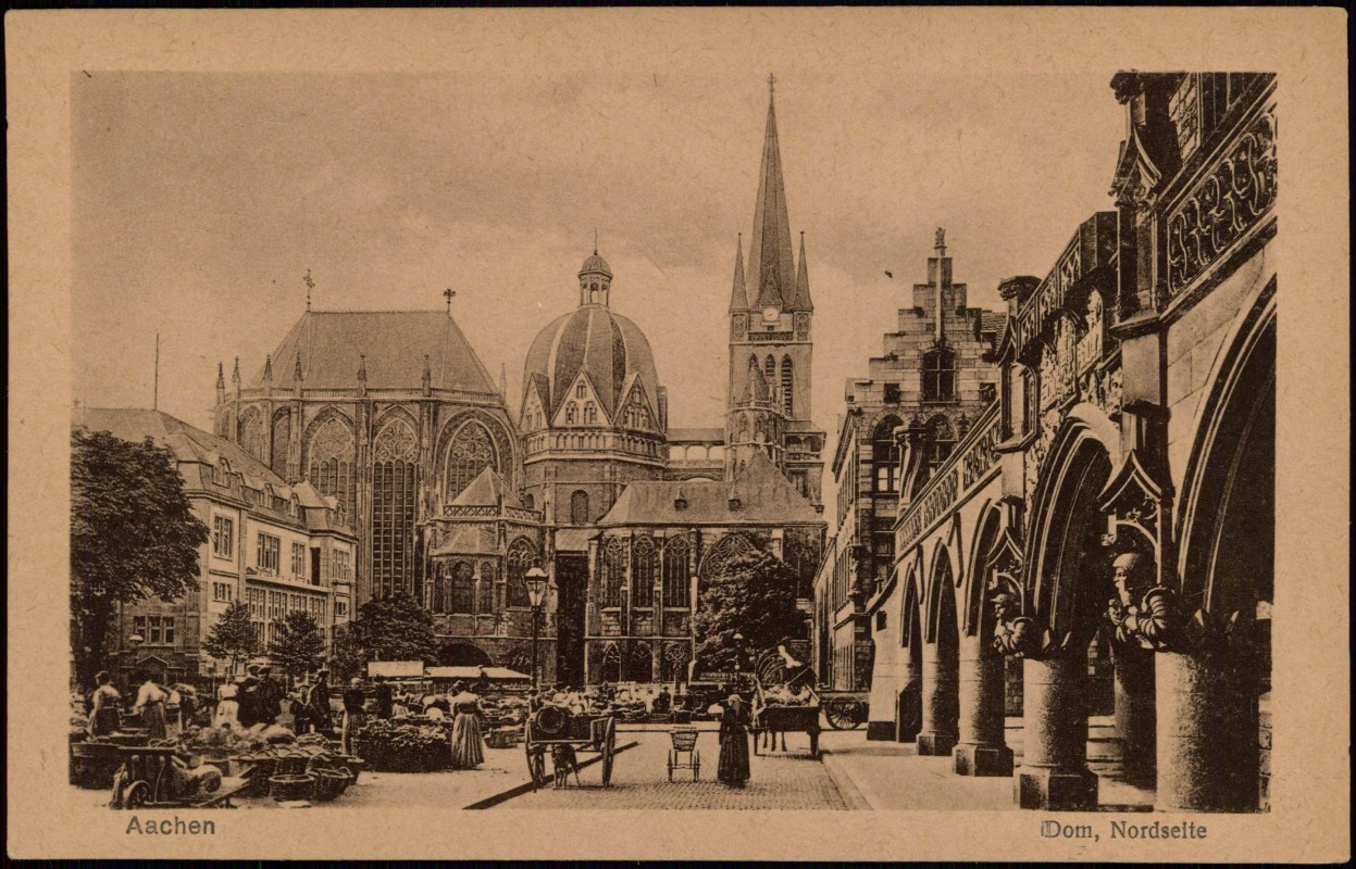 Postcart: Dom, Nordseite - Markttreiben - Aachen