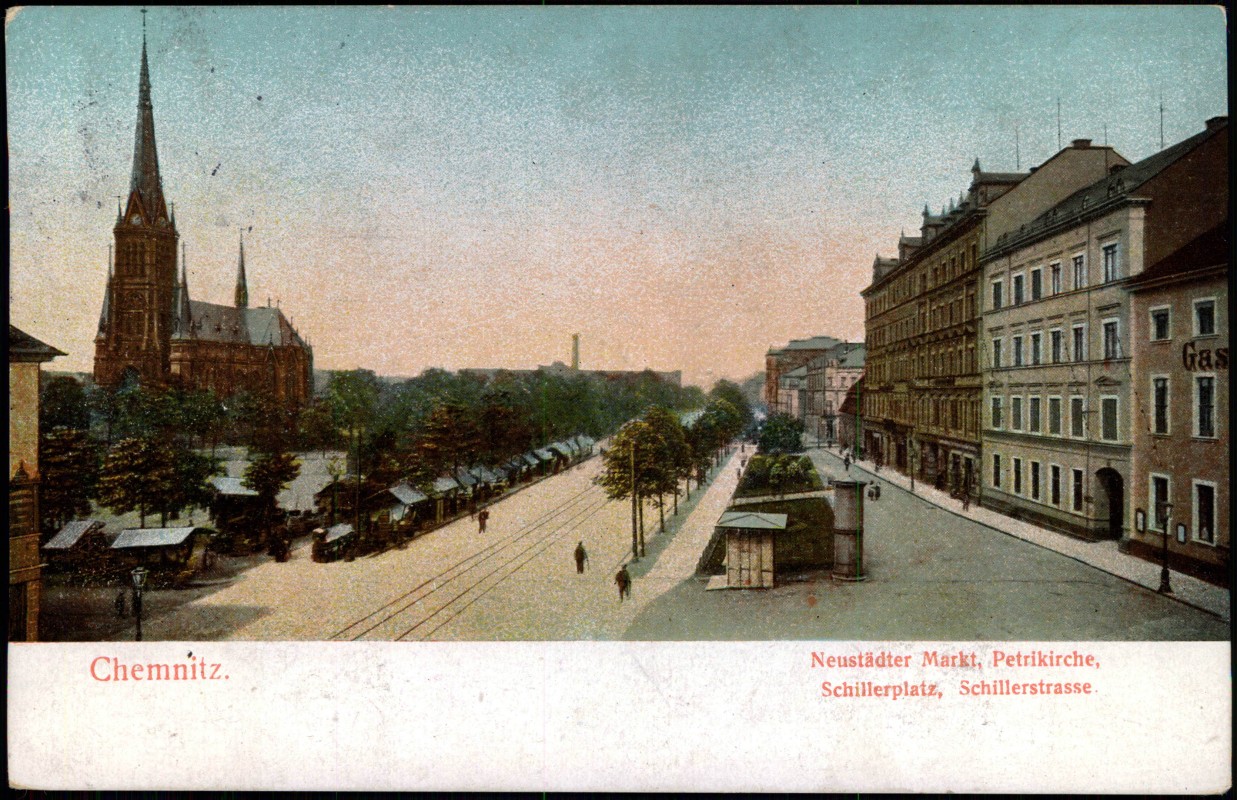 Postcart: Neustädter Markt, Petrikirche,Schillerplatz, Schillerstrasse. - Chemnitz