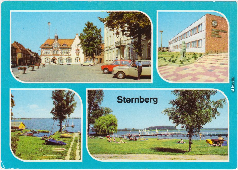 Postcart: Karl-Liebknecht-Platz, Kreiskulturhaus "Benno Voelkner", Am See, Blick zum Freibad - Sternberg (Mecklenburg)