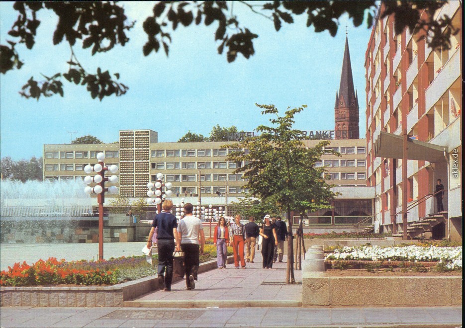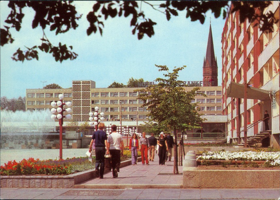 - Karl-Marx-Straße mit Wasserspiel und Blick zur Kirche