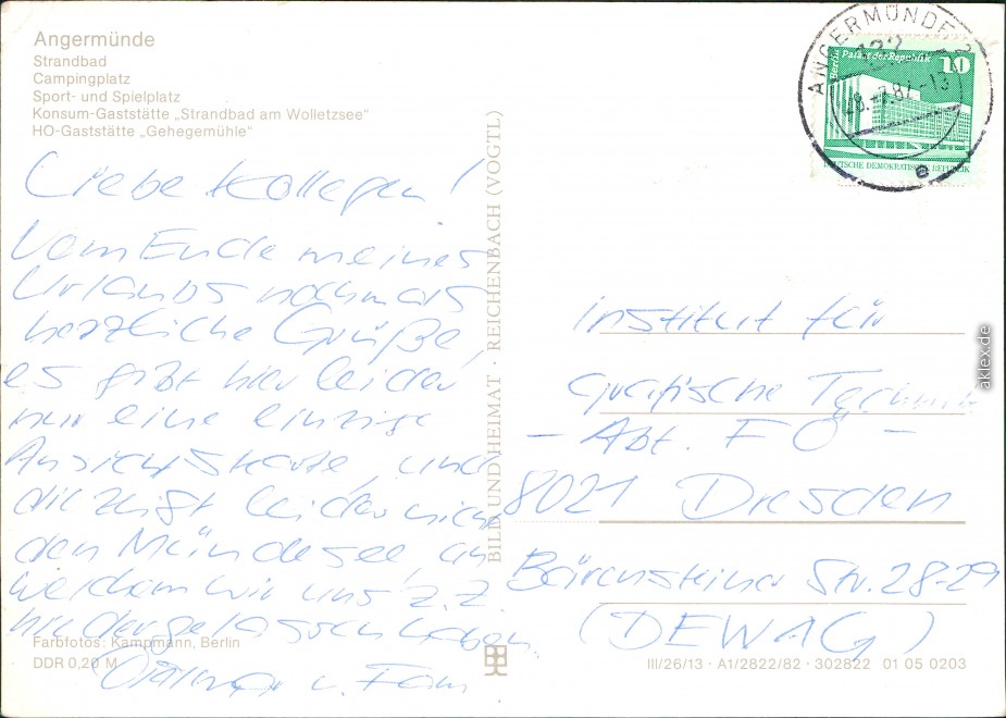 Postcart: Strandbad, Campingplatz, Sport- und Spielplatz, Konsum-Gaststätte "Strandbad am Wolletzsee", HO-Gaststätte "Gehegemühle" - Angermünde