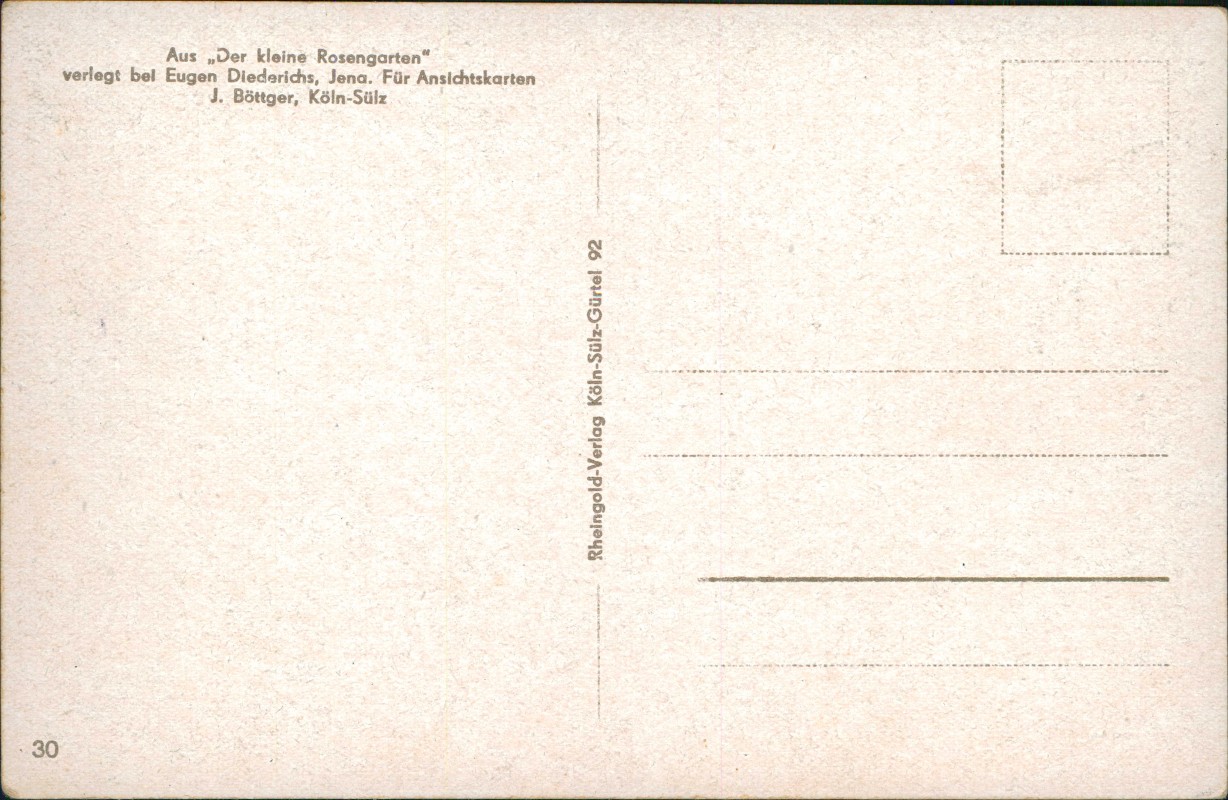 - Grün ist die Heide Als ich gestern einsam ging auf der grünen, grünen Heid, Kam ein junger Jäger an, trug ein grünes, grünes Kleid: Ja grün ist die Heide, die Heide ist grün, Aber rot sind die Rosen, wenn sie da blüh'n! Wo die grünen Tannen stehn, ist so weich das grüne Moos, Und da hat er mich geküßt, und ich saß auf seinem Schoß: Ja grün ist die Heide, usw. Als ich dann nach Hause kam, hat die Mutter mich gefragt, Wo ich war die ganze Zeit, und ich hab' es nicht gesagt: Ja grün ist die Heide, usw. Was die grüne Heide weiß, geht die Mutter garnichts an: Niemand weiß es außer mir und dem grünen Jägersmann: Ja grün ist die Heide, usw. 1/0418 – Verlag J. Böttger, Bad Godesberg, Kronprinzenstr. 49, Tel. 2681 Aus "Der kleine Rosengarten" verlegt bei Eugen Diederichs, Jena Als Ansichtskarten erschienen im Rheingold-Verlag J. Böttger, Bad Godesberg Nr. 30