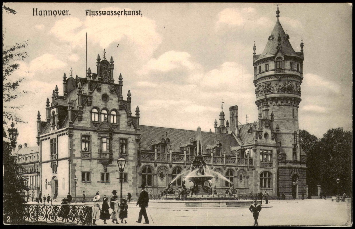 Photo Card: Flusswasserkunst und Gebäude-Ansicht - Herrenhausen-Hanover