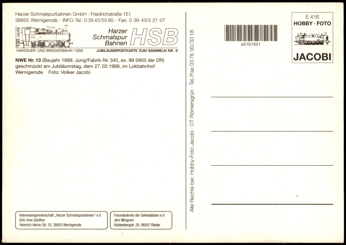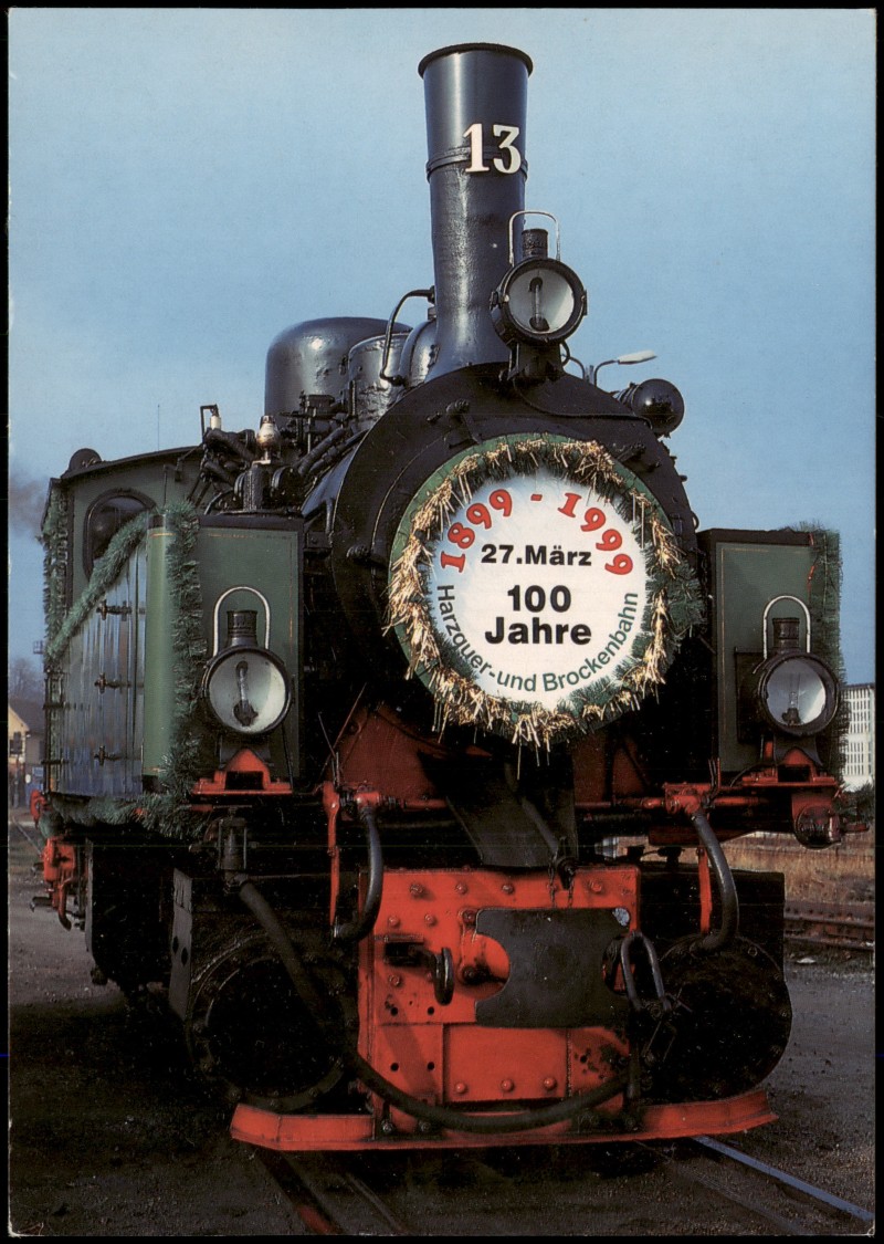 - Jubiläumspostkarte Nr. 2 der Harzer Schmalspurbahnen (HSB) zum 100-jährigen Bestehen der Harzquer- und Brockenbahn im Jahr 1999. Abgebildet ist die NWE Nr. 13 (Baujahr 1899, Jung/Fabrik-Nr. 345, ex. 99 5903 der DR), geschmückt am Jubiläumstag, dem 27.03.1999, im Lokbahnhof Wernigerode. Foto: Volker Jacobi. Herausgeber: Hobby-Foto Jacobi, Römersgrün.