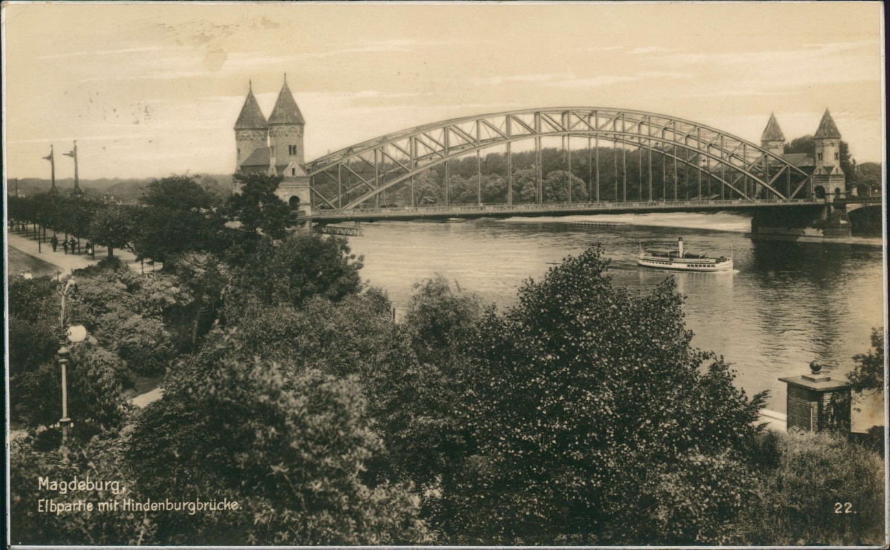 Postcart: Elbpartie mit Hindenburgbrücke - Fotokarte - Magdeburg