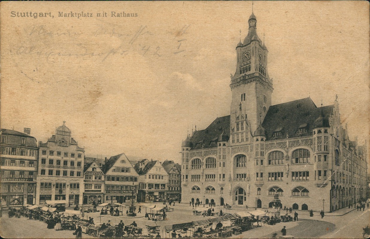 Postcart: Marktplatz mit Markttreiben - Stuttgart